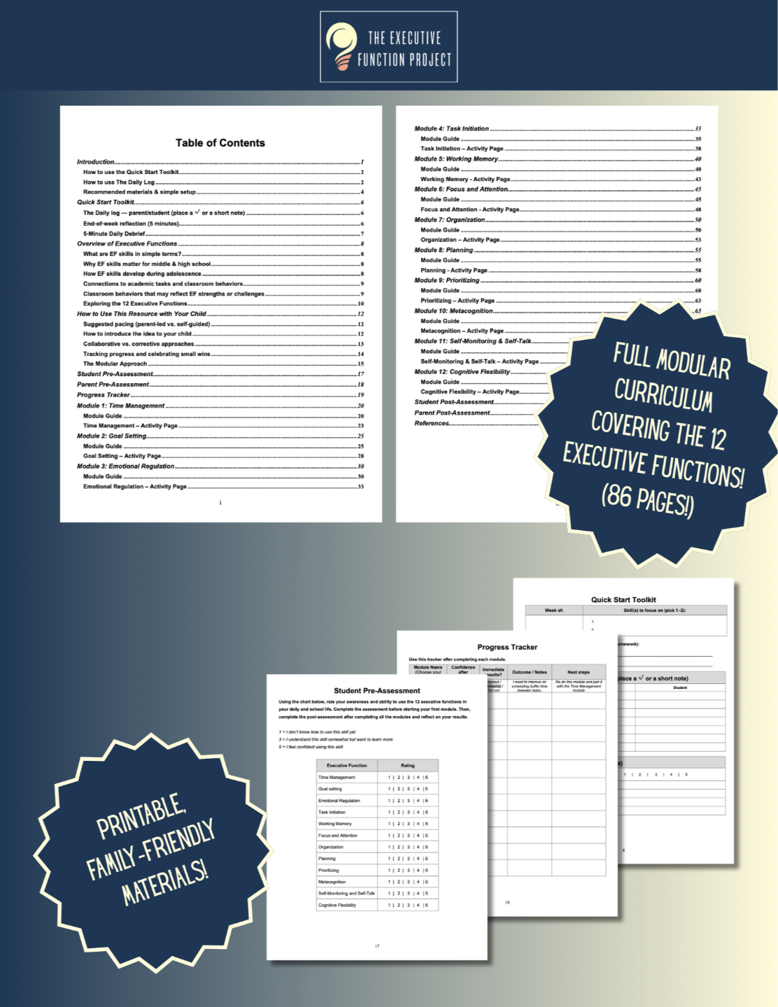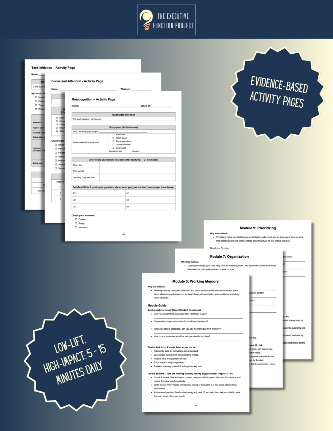 •  12 Module packs (each with module guide, activity page, scripts, tracking forms, and troubleshooting): Time Management; Goal Setting; Emotional Regulation; Task Initiation; Working Memory; Focus & Attention; Organization; Planning; Prioritizing; Metacognition; Self‑Monitoring & Self‑Talk; Cognitive Flexibility.