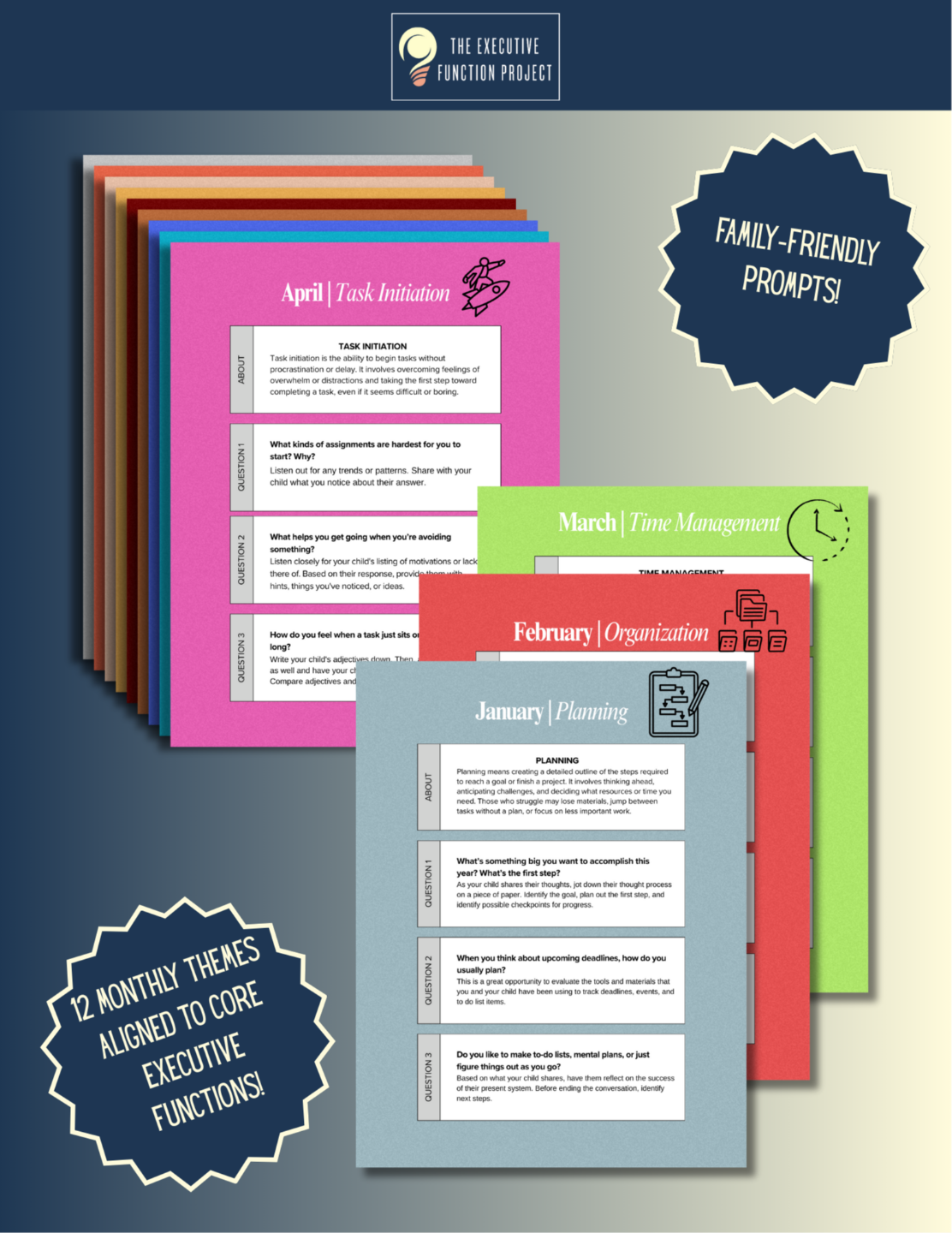 - 12 monthly themes aligned to core executive functions: Planning (Jan), Organization (Feb), Time Management (Mar), Task Initiation (Apr), Goal Setting (May), Working Memory (Jun), Metacognition (Jul), Emotional Control (Aug), Focus & Attention (Sep), Cognitive Flexibility (Oct), Prioritizing (Nov), and Self‑Monitoring (Dec).