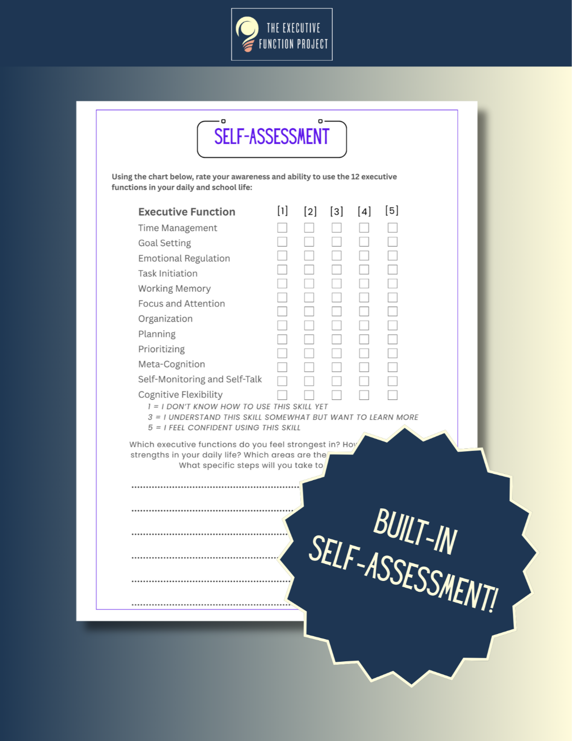 - Culminating self-assessment: Students rate their confidence across all 12 executive functions and set personalized growth goals.