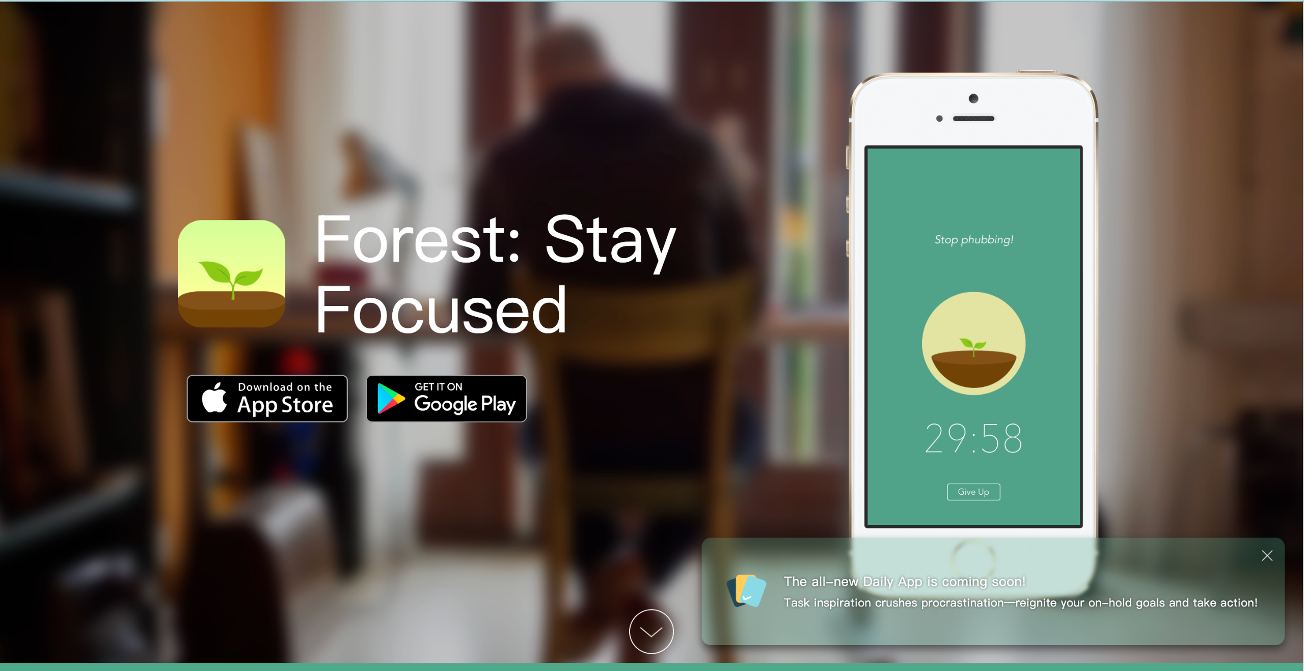 A productivity app that uses gamification to help you stay focused and manage distractions by planting virtual trees while you work and gradually growing a forest.